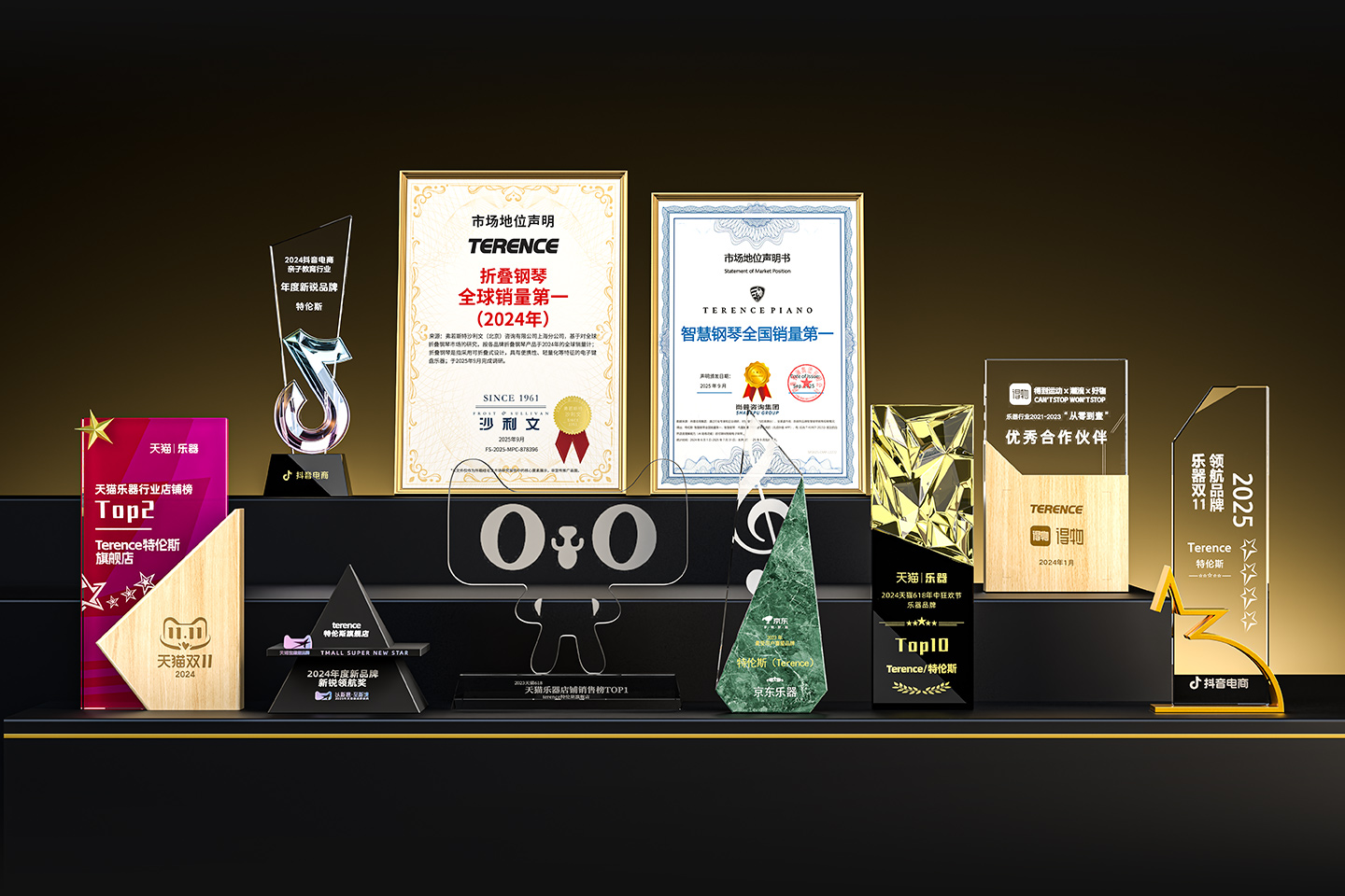 特倫斯創(chuàng)新科技榮獲:折疊鋼琴全球銷(xiāo)量第一(2024年)[1]、智慧鋼琴全國(guó)銷(xiāo)量第一[2]、2025年天貓618樂(lè)器設(shè)備店鋪榜TOP2、2025年天貓雙11樂(lè)器店鋪榜TOP1、2025年天貓雙11樂(lè)器品牌榜TOP3、2022年天貓樂(lè)器行業(yè)TOP1、2023年天貓618樂(lè)器行業(yè)TOP1、2024抖音電商年度新銳品牌、2024天貓樂(lè)器店鋪TOP2、2024天貓年度新品牌新銳領(lǐng)航獎(jiǎng)、2023年京東最受用戶喜愛(ài)品牌等獎(jiǎng)項(xiàng);